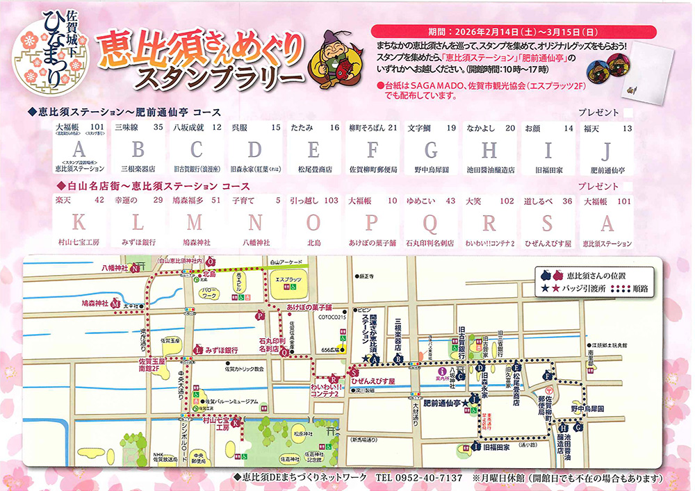 スタンプを集めたら「恵比須ステーション」「肥前通仙亭」のいずれかへお越しください。